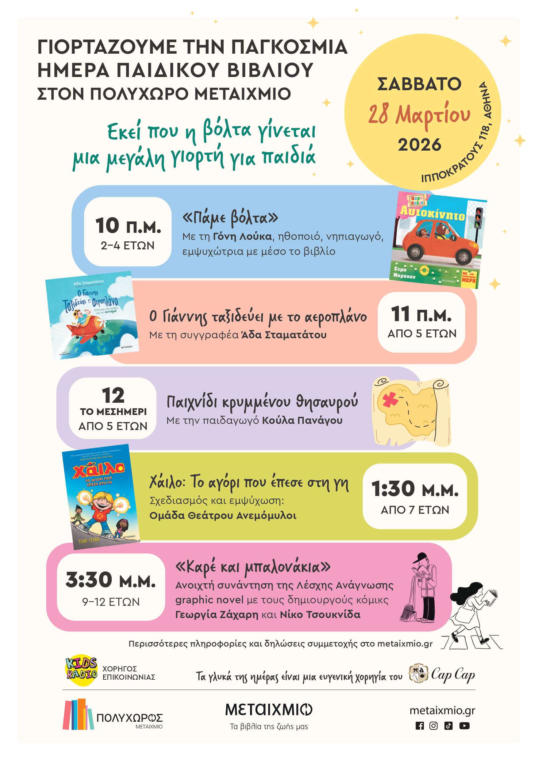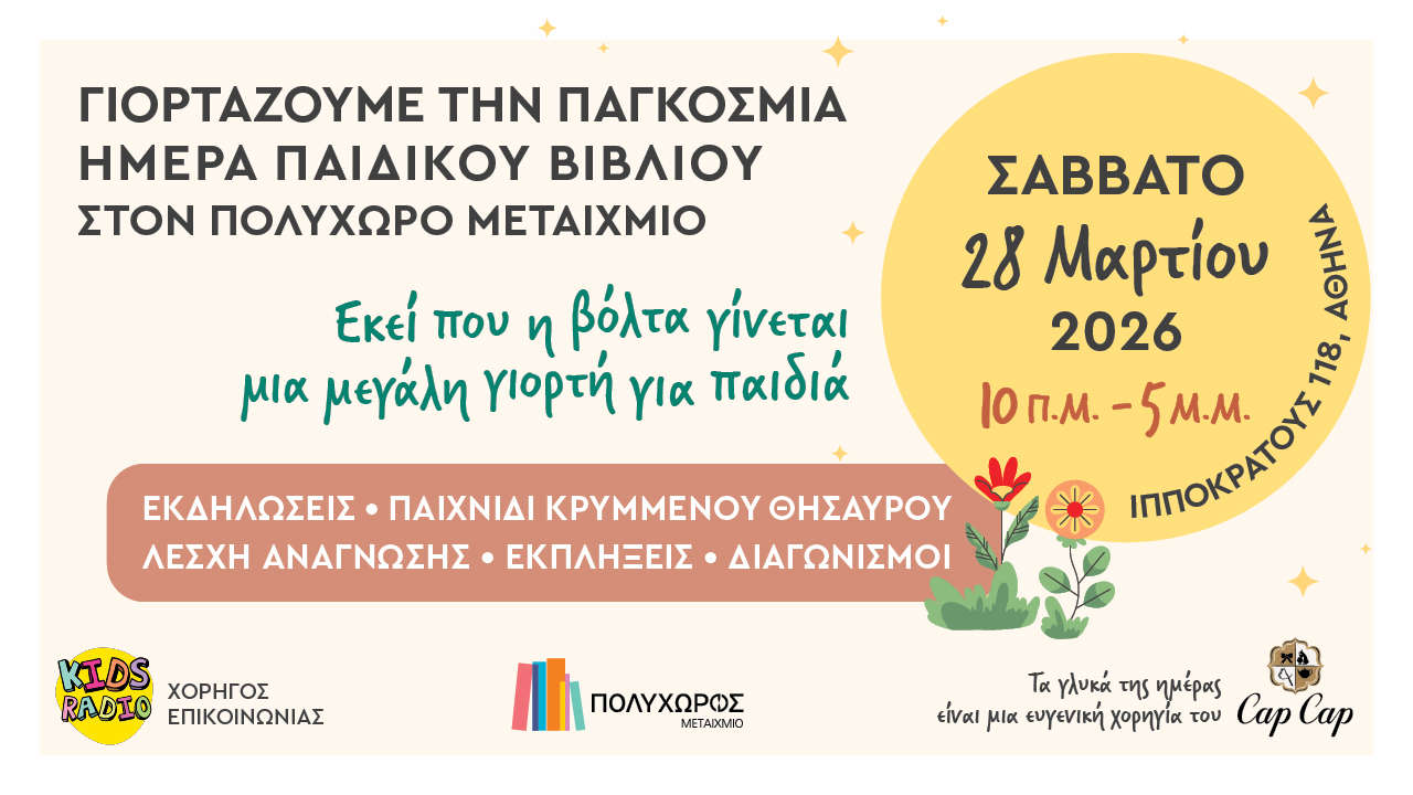 Το Σάββατο 28 Μαρτίου 2026, από τις 10 το πρωί έως τις 5 το απόγευμα, υποδεχόμαστε τους μικρούς μας φίλους και τους συνοδούς τους στον φιλόξενο ΠΟΛΥΧΩΡΟ ΜΕΤΑΙΧΜΙΟ (Ιπποκράτους 118, Αθήνα), σε μια γιορτή γεμάτη βιβλία, φαντασία και χαμόγελα.